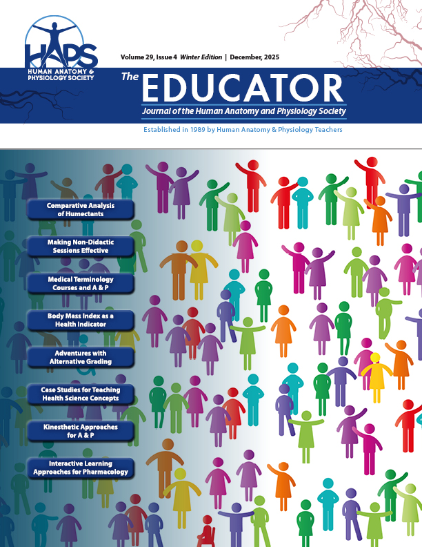 This Winter edition explores various innovative strategies in teaching physiology and related subjects, aimed at enhancing student engagement and learning outcomes. This includes: 1. Comparative Analysis of Humectants, 2. Making Non-Didactic Sessions Effective, 3. Medical Terminology Courses and A & P, 4. Body Mass Index as a Health Indicator, 5. Adventures with Alternative Grading, 6. Case Studies for Teaching Health Science Concepts, 7. Kinesthetic Approaches for A & P, and 8. Interactive Learning Approached for Pharmacology