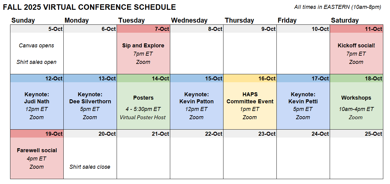 The HAPS Virtual Conference Committee is excited to host a nine day Virtual Conference from October 11-19, 2025. We can’t wait to see you there! Check out all the information below!